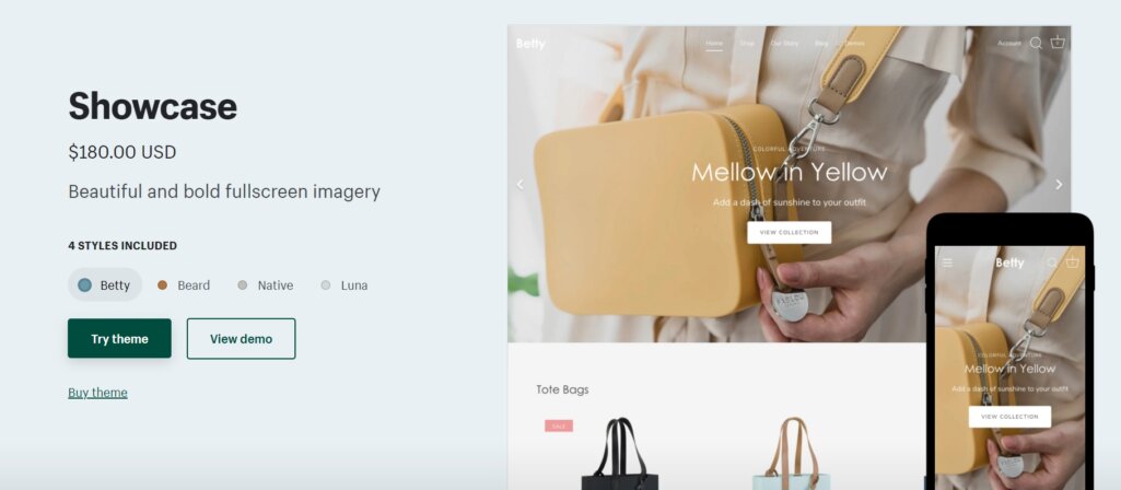 showcaseは、ブランドのイメージやメッセージを、ファースビューでしっかり伝えられるテーマです。ビデオの表示機能や高解像度画像をフルスクリーンで表示できる機能などを備え、魅せ方に注力できます。単品商品を扱うサイトや、少数の品物を厳選してPRしたいサイトにおすすめです。アパレル雑貨や家具など、こだわりの実用品を扱う業種に適しています。