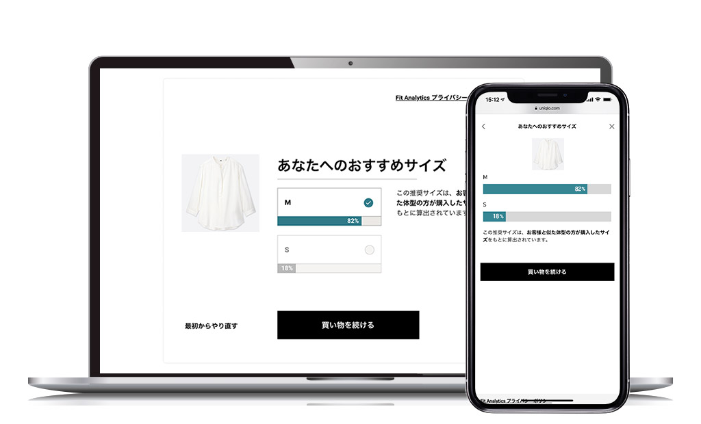MySize ASSISTでは、商品ページのサイズ下に存在する「自分に合うサイズを確認する」ボタンを押し、いくつかの質問に答えることで、ユニクロがおすすめのサイズをサジェストしてくれるサービスです。このような、いくつかの質問に答えるとおすすめのサイズを教えてくれるサービスを提供しているECサイトは最近増えています。