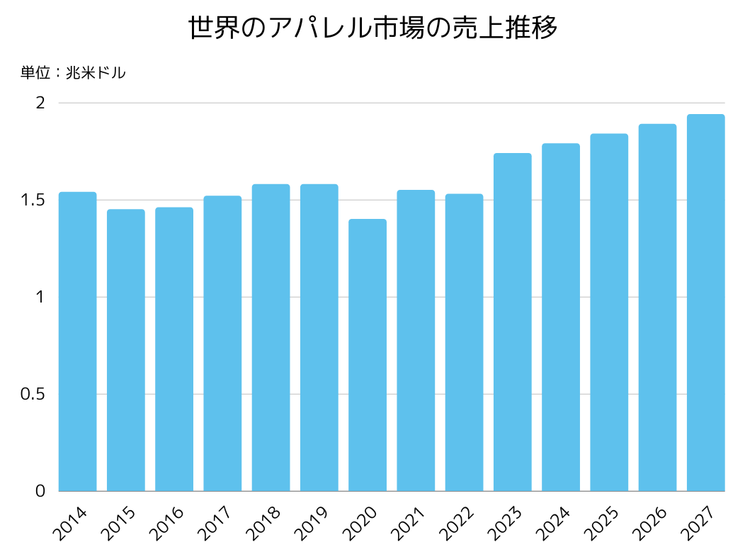 ここまで、日本のアパレル市場についてみてきましたが、ここからは世界のアパレル市場について解説します。まずは「世界のアパレル市場の売上推移」です。