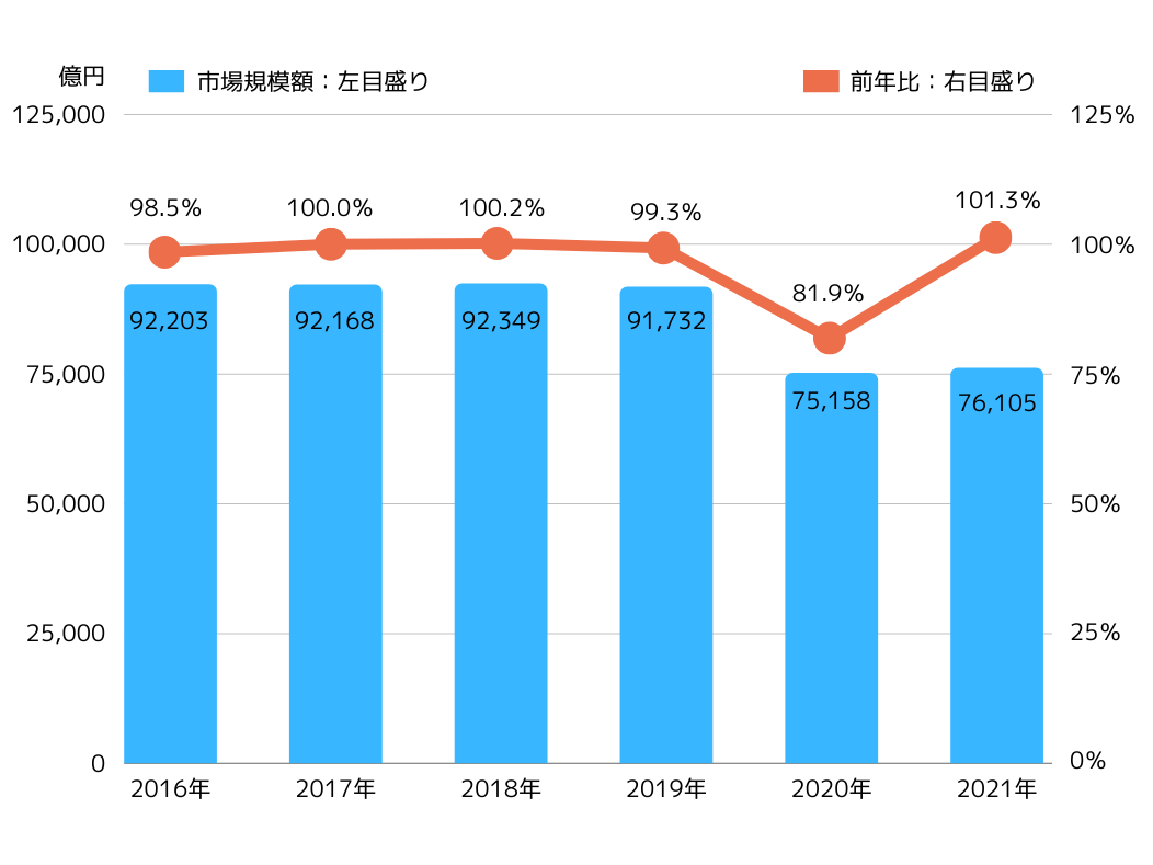 全盛期の1990年から2019年に至るまで、市場縮小の要因としては以下2点が挙げられます。