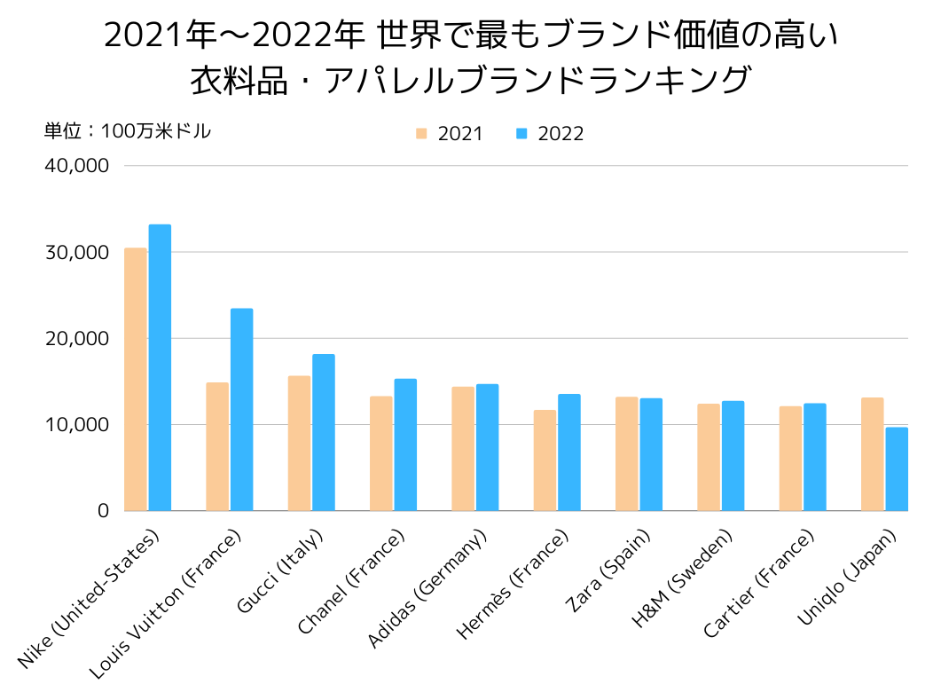 ナイキがトップです。次いでルイヴィトン、グッチ、シャネルと続きます。日本のユニクロは10番目です。