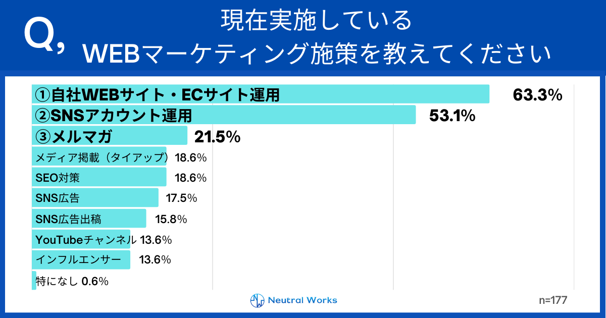 最も実施されているWebマーケティング施策は、「自社Webサイト・ECサイト運用」の63.3%でした。続いて、「SNSアカウント運用」の53.1%。この2つは50%以上となっています。多くの企業がオフラインのみならずオンラインでの集客を実施していることが分かります。