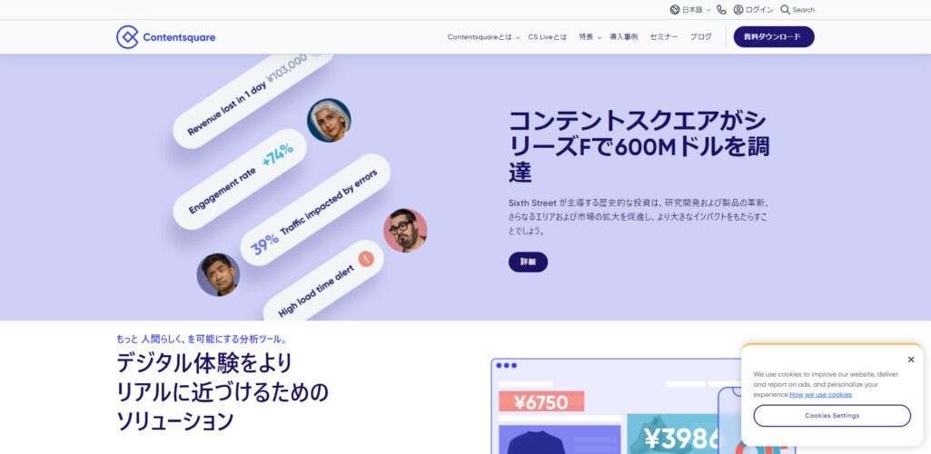 Contentsquareは、タグ付け不要でデータ分析ができるツールです。利用できるヒートマップは5つの種類をあわせたようなもので、スクロールやクリック、迷いなどのユーザー行動が分析できます。Contentsquareの拡張機能を活用すれば、サイトページに最新情報を重ねて表示することも可能です。