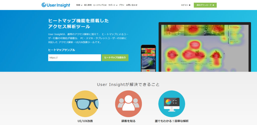 デモの依頼もできるので、デモ版でどの程度、自社で活用できるのかまずは確認することをおすすめします。ヒートマップ以外にも、インサイトの自動化や直感的操作で使えるビジュアルレポーティング機能、パソコンとスマホ両方で使えるマルチデバイスにも対応しているなど、使いやすさも、あわせ持っています。