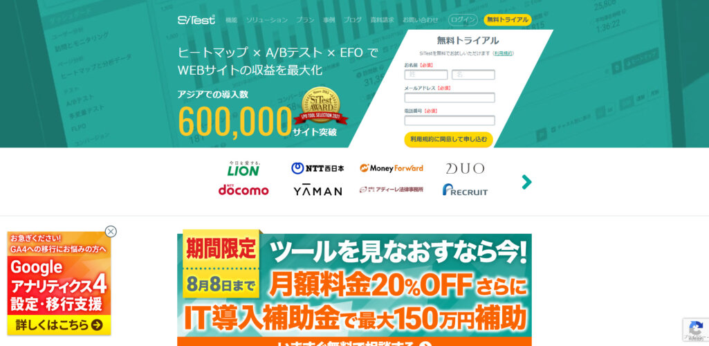 SiTestは、Webサイトの解析から改善までを一元化できる、ランディングページ最適化ツールです。イートアップを含めた6つの解析ページ機能を使用でき、5種類のヒートマップにも全て対応しています。