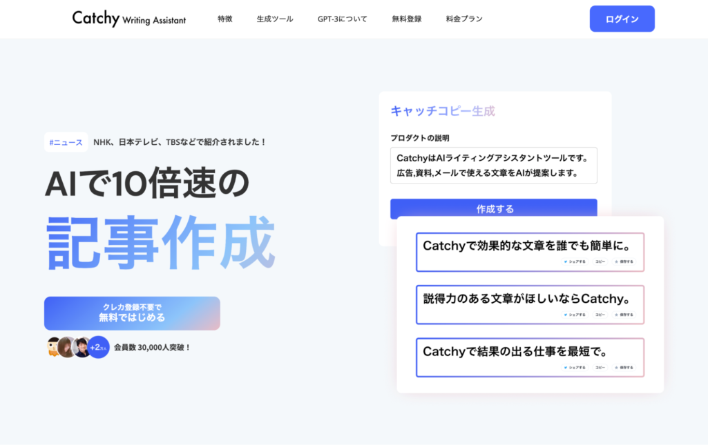 Catchyは、記事作成だけではなく、キャッチコピーやYouTubeの企画、新規事業のアイデアなど、100種類以上のコンテンツの生成ツールを用意している有料のAI記事作成ツールです。