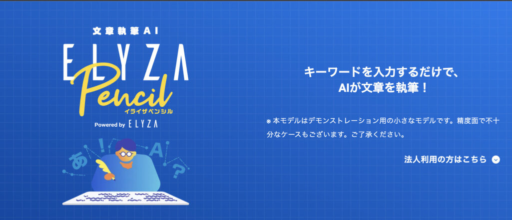 ELYZA Pencilは、キーワードを入力するだけでAIが文章を執筆してくれるツールです。デモンストレーションモデルでは、ニュース記事やメール文、職務経歴書などを作成することができます。法人向けの有料プランもあります。