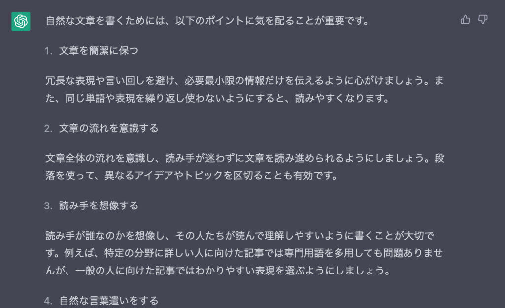 AIツールでは、機械らしさのない自然な文章が自動生成できます。試しにChatGPTで「自然な文章の書き方」を質問してみました。