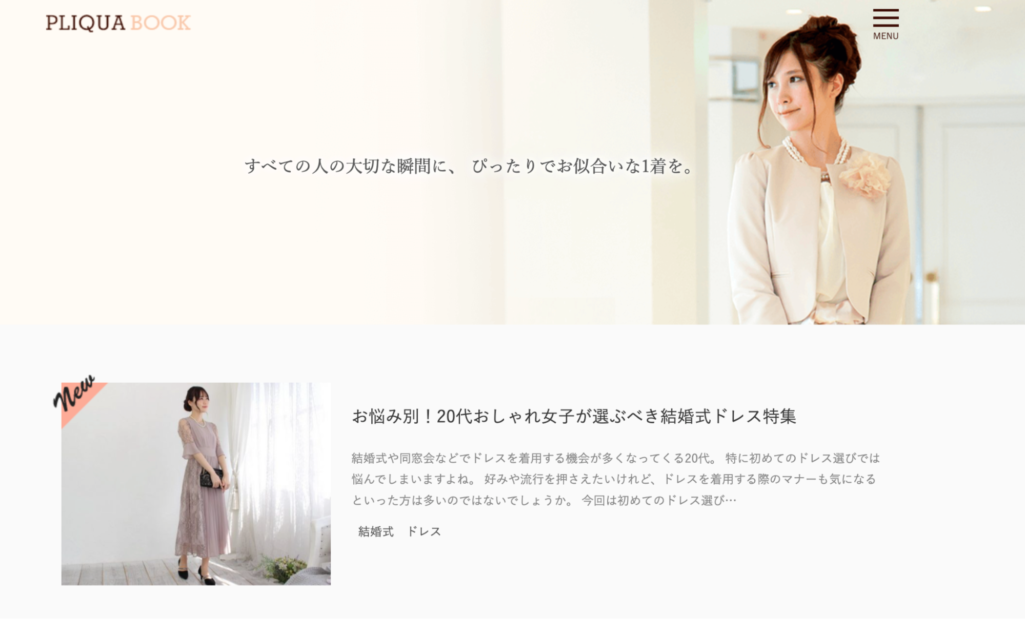 例えば、成功事例で紹介したPLIQUA BOOKでは、結婚式に何を着ていけばよいのかわからない女性のために、フォーマルファッションのマナーについて記事化・発信しています。この情報によって、ユーザーは何を着ればよいのかがわかり、紹介された商品が気に入ればそのまま購入することもできます。