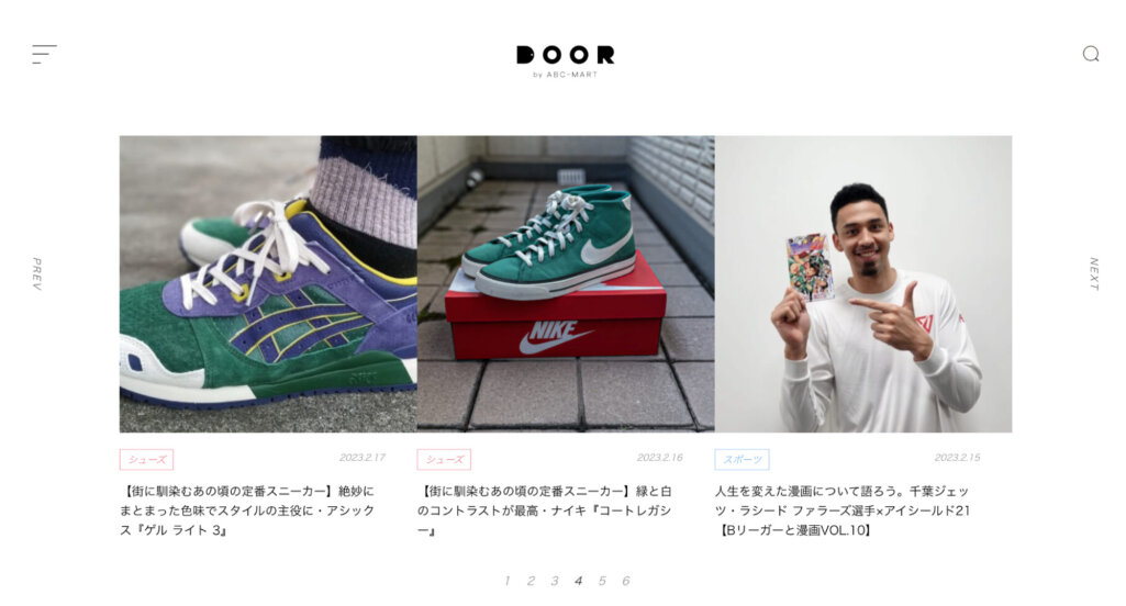 DOORは、ABCマートが運営するスニーカーを中心としたオウンドメディアです。靴の選び方などのノウハウ系の記事と、靴の愛用者へのインタビュー記事とのバランスがとれているのが特徴です。