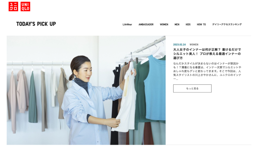 ユニクロのアイテムを使ったコーディネートや洋服のお手入れ方法などを発信しています。ユニクロの着こなしを知れるため、普段からユニクロを着ているユーザー必見のオウンドメディアです。