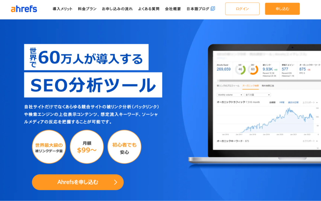 Ahrefsは、SEOの被リンク分析と競合調査が行えるツールです。特にSEOで競合がどのようなサイトから被リンクを得ているのか確認するために利用されています。