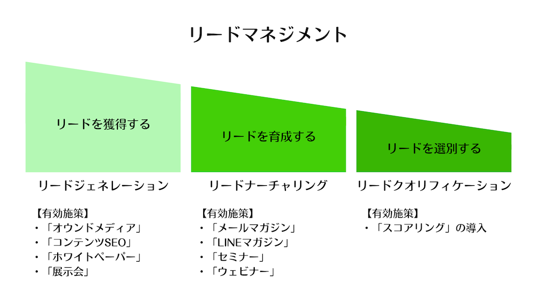 BtoB企業がコンテンツマーケティングを実施する際は、リード獲得を売り上げにつなげるための「リードマネジメント」を意識することが重要です。リードマネジメントは次の3つの段階があります。