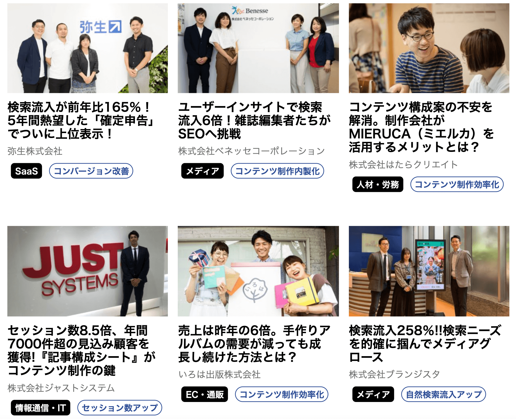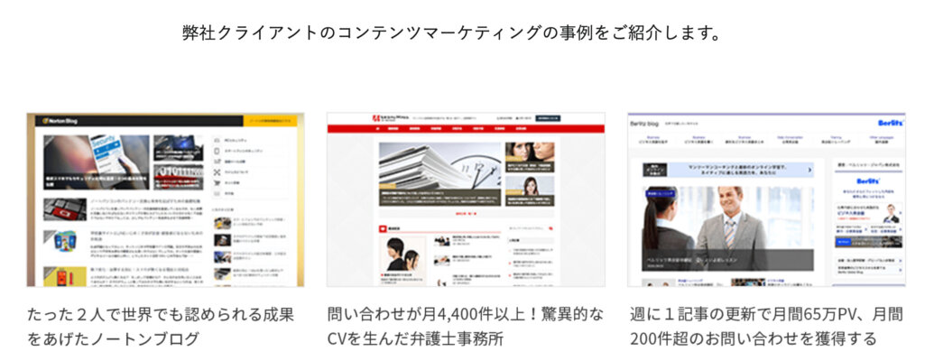 自社メディアはもちろんのこと、支援実績は2,000社を超えており、有名企業のコンテンツマーケティングにおける実績も豊富です。実績例は以下のとおりです。