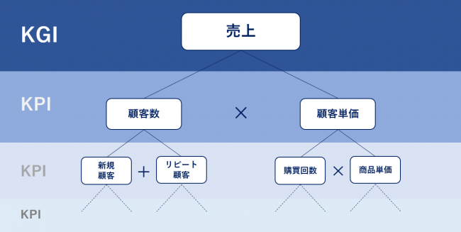 KPIツリーを作成することにより、どのKPIを向上させれば、ビジネスゴールを達成できるのか容易に判断できるようになります。たとえば、KGIを売上に設定した場合、次の図のようにKPIツリーを設定できます。