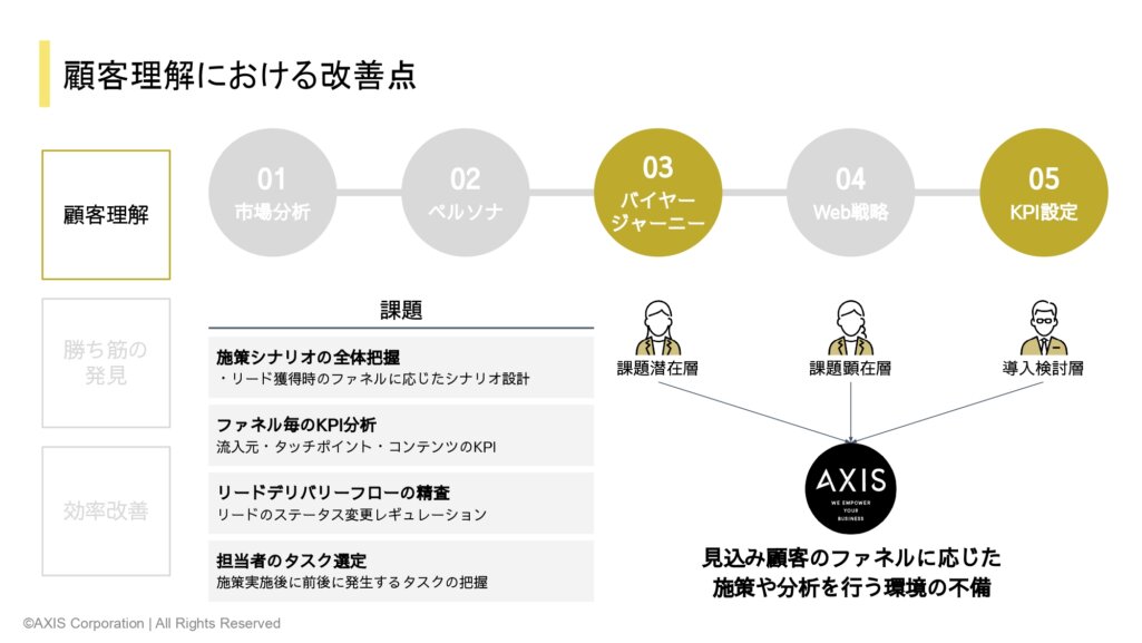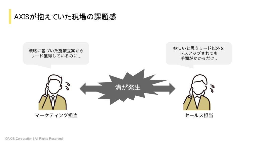 アクシスでは、当初はセールスフォースを導入しましたが効果を得られず、他のプラットフォームに移行しました。しかし、課題解決に至らず、特にナーチャリングと商談化に課題がありました。