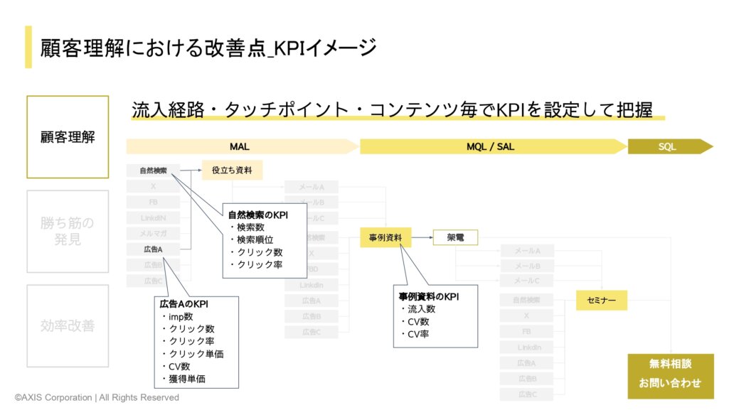 集客に関するKPIは適切に設定されていましたが、商談化やそれ以降の段階に関するKPIが不足していたことが課題として明らかになりました。