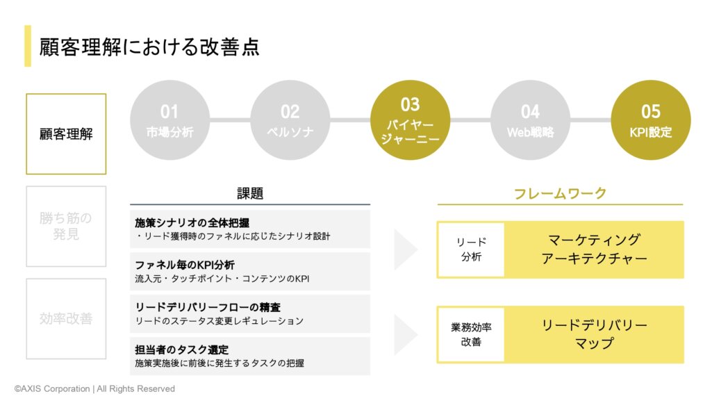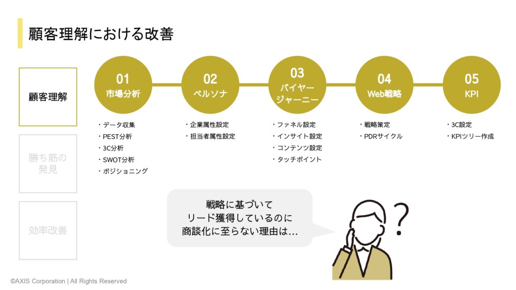 まず、お客様を理解するための戦略フレームワークの見直しを行い、その中で勝ち筋を見つけ出します。その後、投資効率や業務効率を向上させるための取り組みを行います。