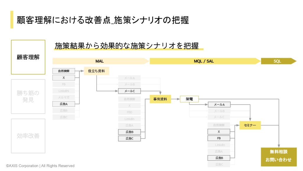 1つ目のポイントは、施策シナリオの全体把握です。これは、お客様がどの段階にいるかに応じて、異なるタイミングで我々の情報を受け取ることになるため、全体像を把握することが重要です。