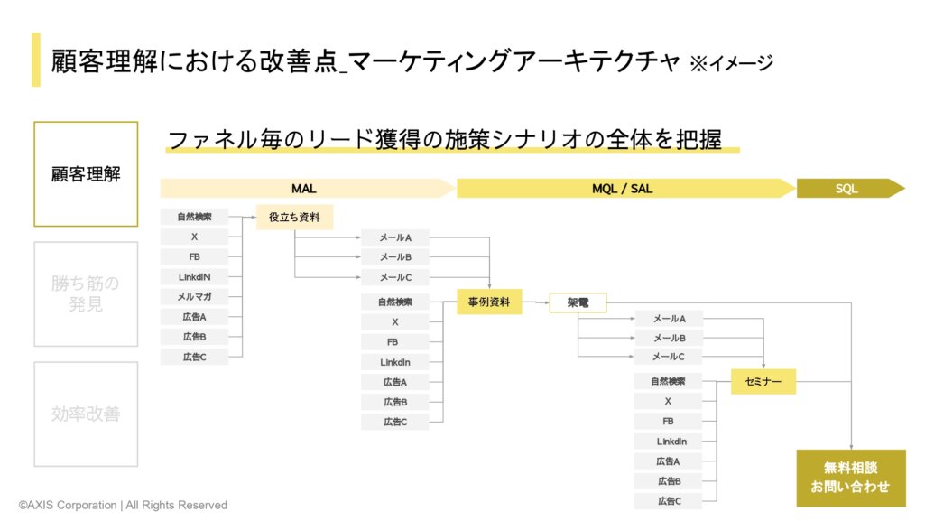 1つ目のフレームワークは、お客様の分析やリードの分析、見込みお客様の分析を強化するためのものです。これは「マーケティングアーキテクチャ」と呼ばれ、社内での理解を促進するために導入されました。