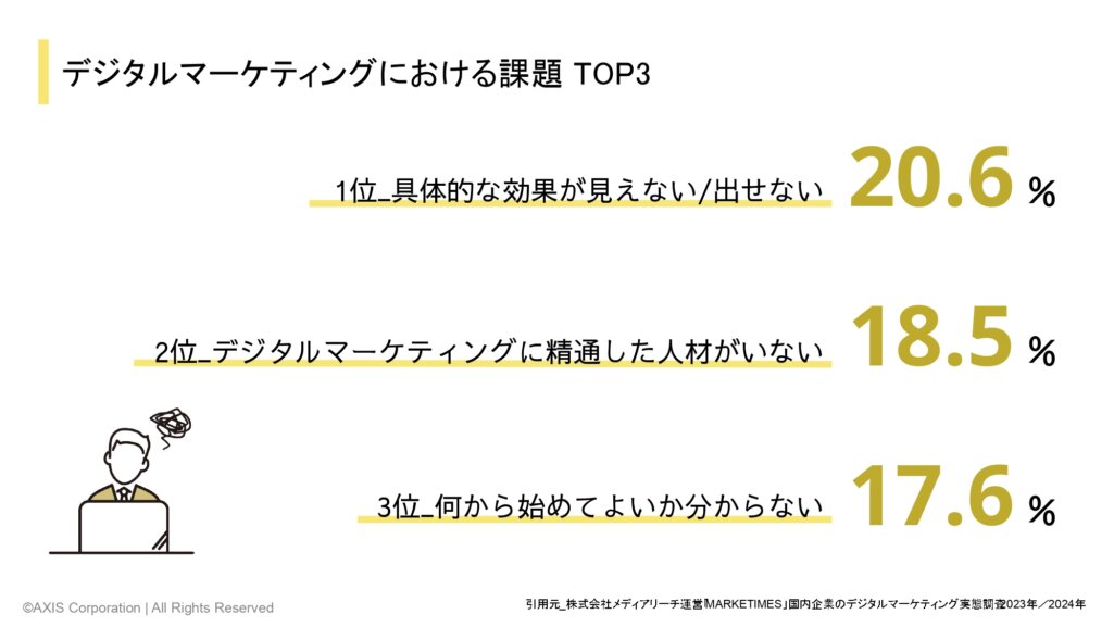これらの課題は、多くの企業がデジタルマーケティングの実践において直面している共通の問題です。