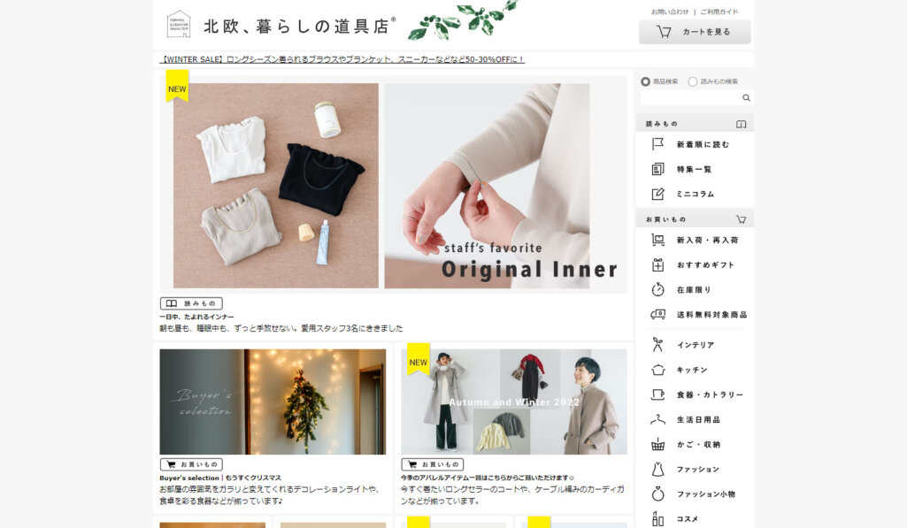 北欧、暮らしの道具店には「フィットする暮らし、つくろう。」というコンセプトがあります。等身大の自分を楽しむような雰囲気があり、サイトのデザインも落ち着いた印象となっています。