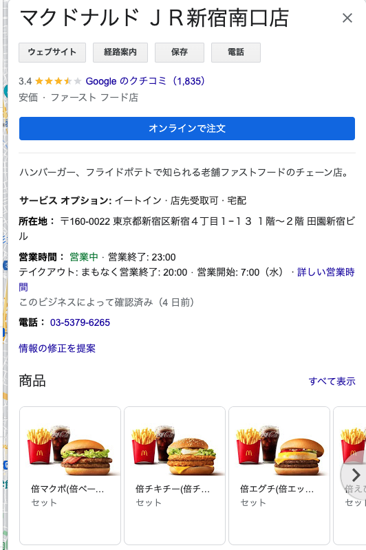 Googleマイビジネスの投稿機能では、店舗の最新情報を発信できます。店舗に関係する内容であれば、投稿の内容は基本的にどのようなものでも構いません。飲食店の場合は、新しいメニューや営業時間の告知、お得な情報の配信を行うために活用されることがほとんどです。最新情報を更新すると、Googleマップで上記のように表示されます。