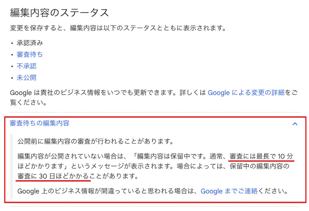 上記の点を審査するようです。編集内容は通常数分〜数時間で反映されることが多いですが、Googleによる確認が必要な場合は最大で30日程度かかることもあります。