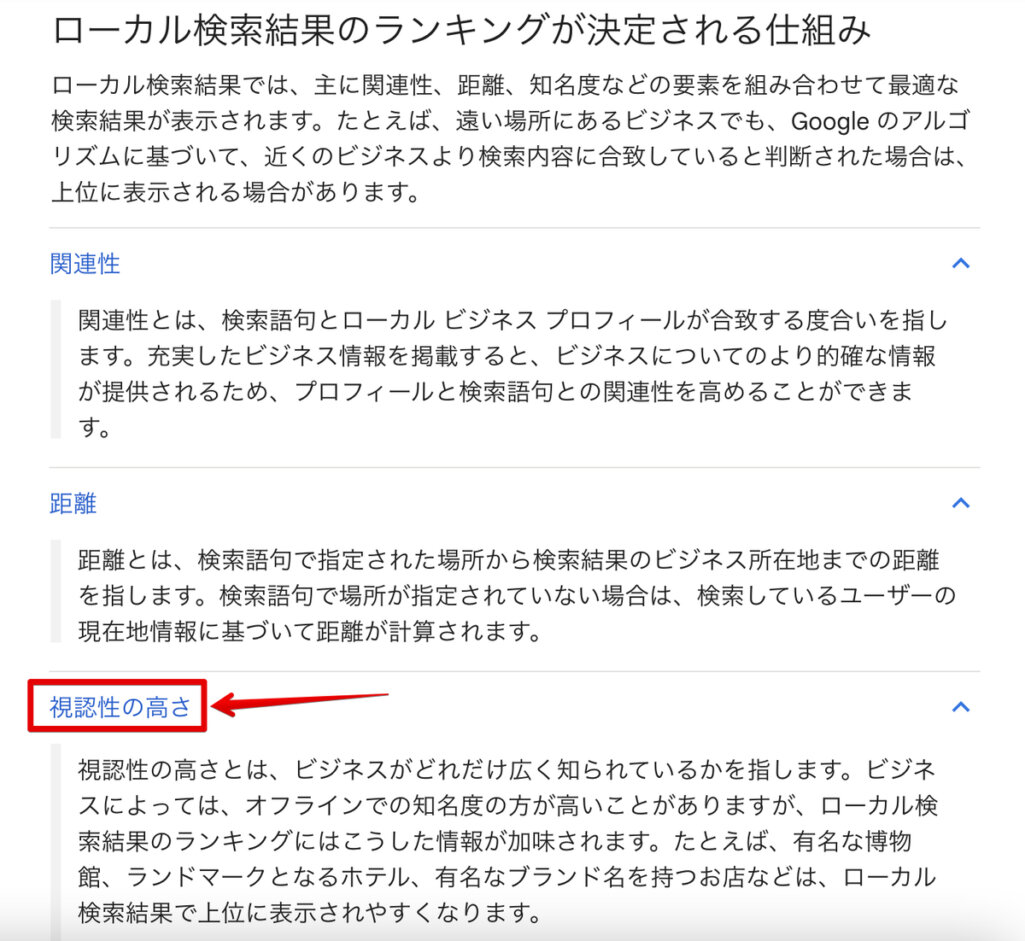 これまで、ローカル検索は関連性・距離・知名度が結果に影響していると「Googleビジネスプロフィールヘルプ」に記載されていましたが、「知名度」が「視認性の高さ」に変更されています。