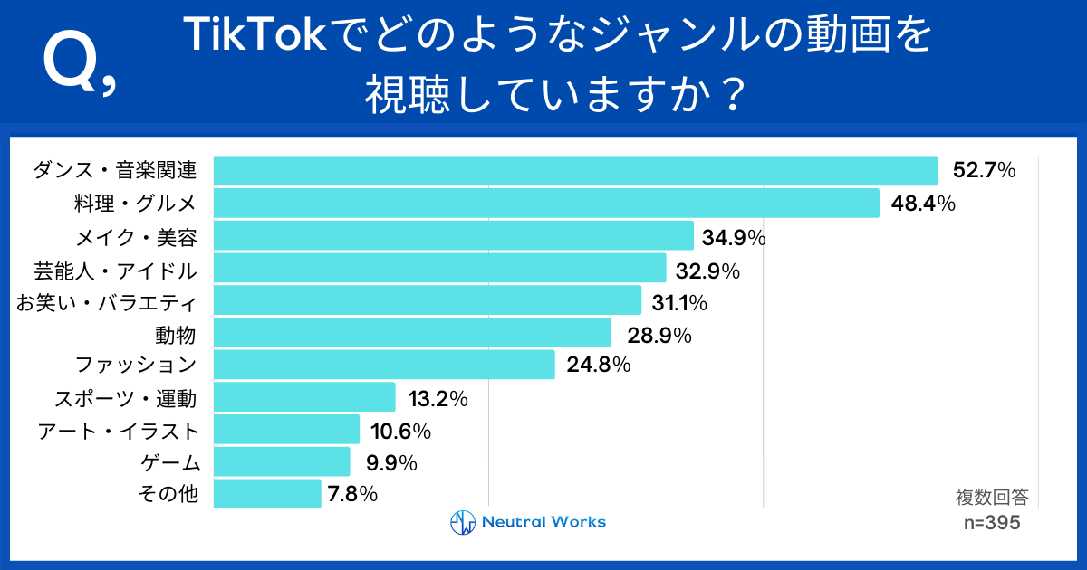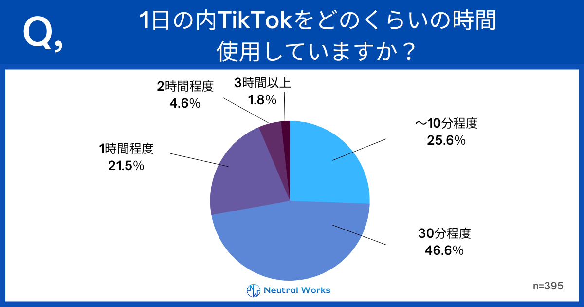 デジタルマーケティング支援をしている株式会社ニュートラルワークスは、TikTokを日常的に使用している男女395名を対象に、TikTokの利用に関する実態調査を行いました。