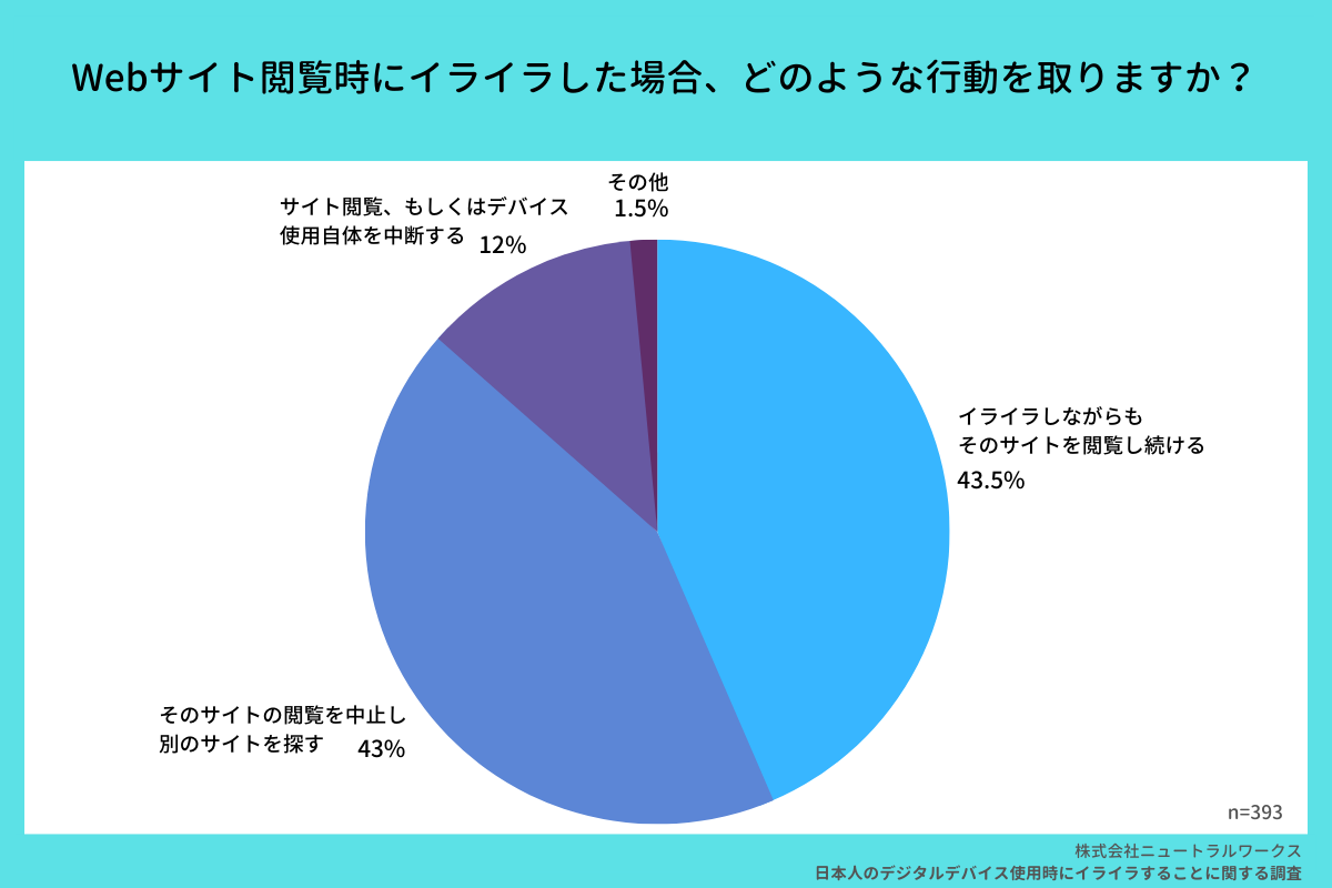 最後に、「Webサイト閲覧時にイライラした場合、どのような行動を取りますか?」という質問に対しては、「そのサイトの閲覧を中止し、別のサイトを探す」が43%で、「イライラしながらも、そのサイトを閲覧し続ける」の43.5%と並ぶ結果になりました。約半数ものユーザーが、「表示速度の遅さ」や「広告」によって、そのサイトから離脱する可能性が高いことを示しています。