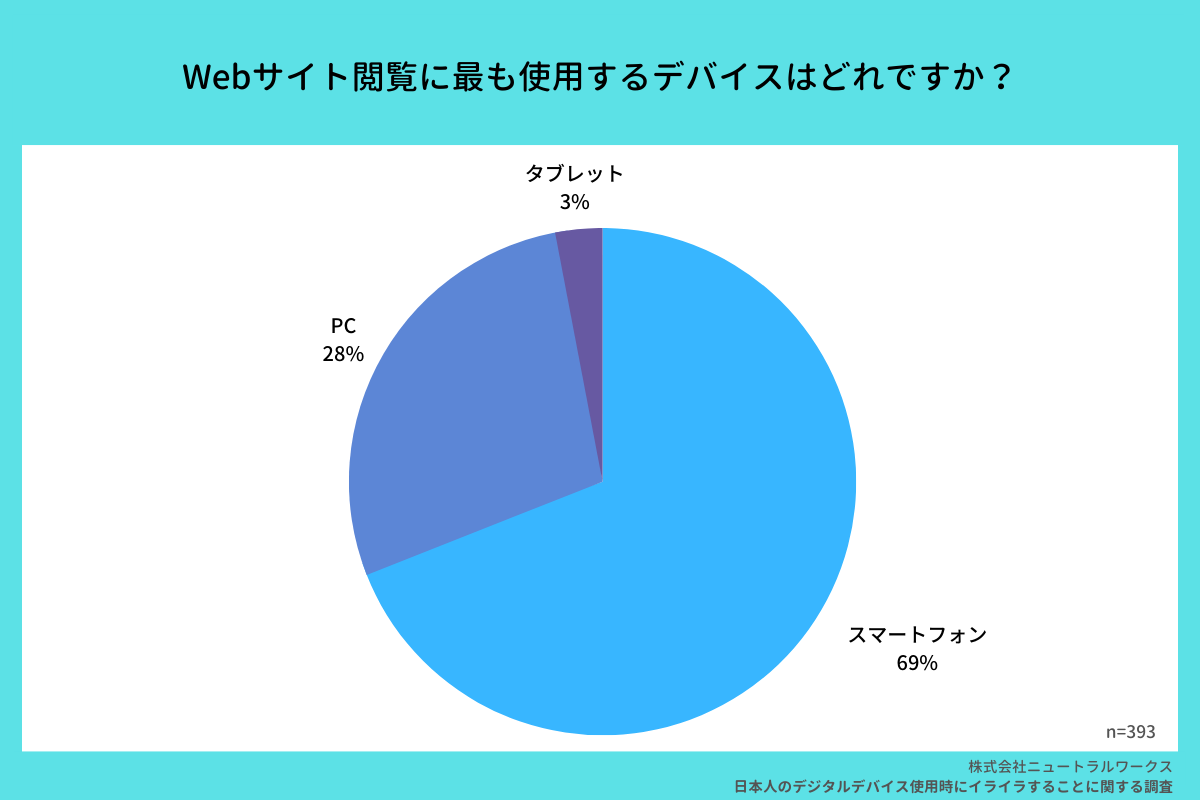 まず、「Webサイト閲覧に最も使用するデバイスはどれですか?」について伺うと、「スマートフォン」(69%)、「PC」(28%)、「タブレット」(3%)という結果になりました。