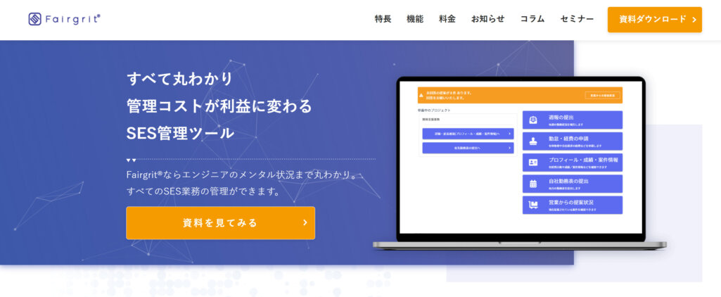Fairgrit®は、SES(システムエンジニアリングサービス)事業に特化した、業界特化型SaaSです。
