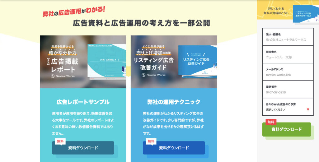 弊社ニュートラルワークスはWEBサイト制作事業を中心としている会社で、企画・戦略立案からシステム構築、SEO施策など幅広いサポートをワンストップで提供しています。ニュートラルワークスのホワイトペーパーは「広告レポートサンプル」と「弊社の運用テクニック」の2種類があります。前者は広告掲載の運用を振り返って改善を図るレポートとなっており、後者はリスティング広告の改善ガイドとなっていて、どちらも課題解決系の内容になっています。