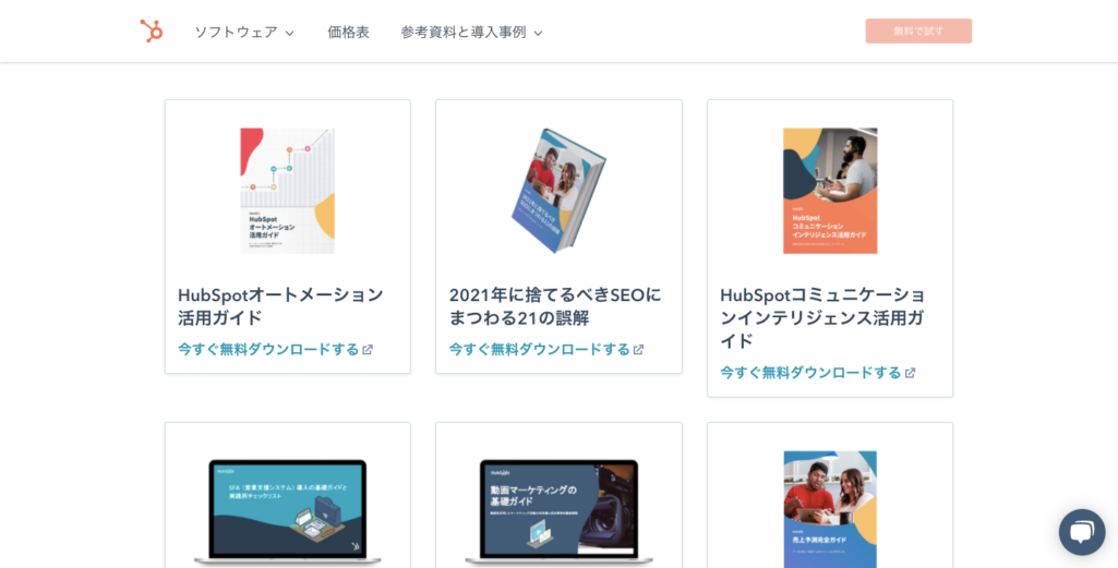 Hubspotのホームページに掲載されているホワイトペーパーのうち、「HubSpotオートメーション活用ガイド」は導入・購入事例系のホワイトペーパーです。そして「2021年に捨てるべきSEOにまつわる21の誤解」は課題解決系、「2021年版セールスイネーブルメントに関するグローバル調査」は最新情報・レポート系のホワイトペーパー となっています。