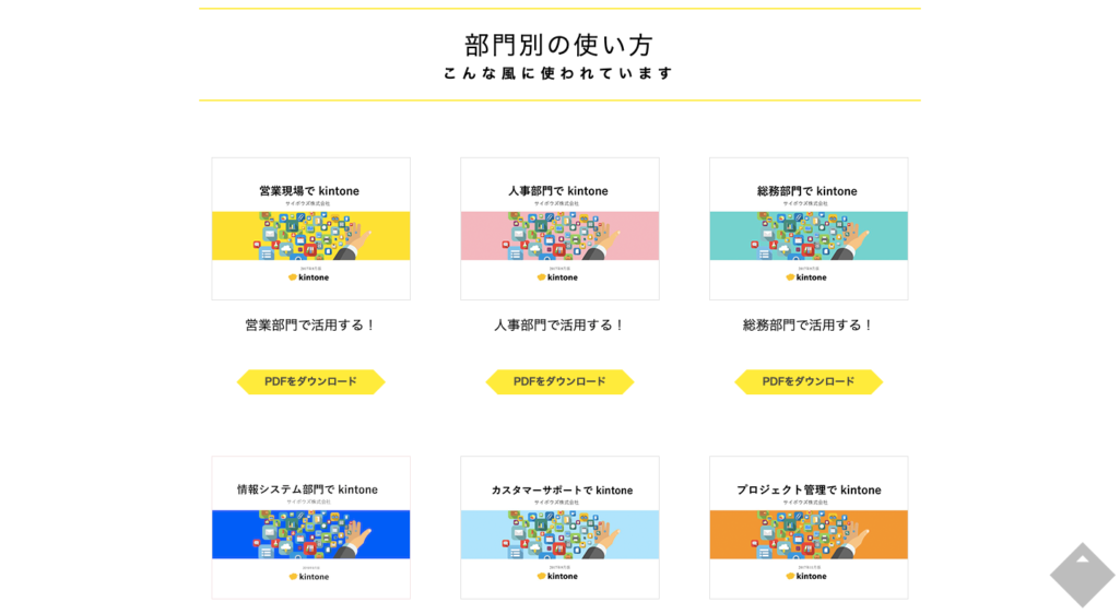 サイボウズはソフトウェア開発会社で、クラウドベースのグループウェアや業務改善サービスを展開しています。サイボウズのホームページではキントーンというツールに関する資料を掲載しているのですが、「営業部門」「人事部門」「総務部門」といった、部門別に分類したホワイトペーパーとなっています。そのため、ユーザーの属性に合わせてツールの使用方法を確認できます。