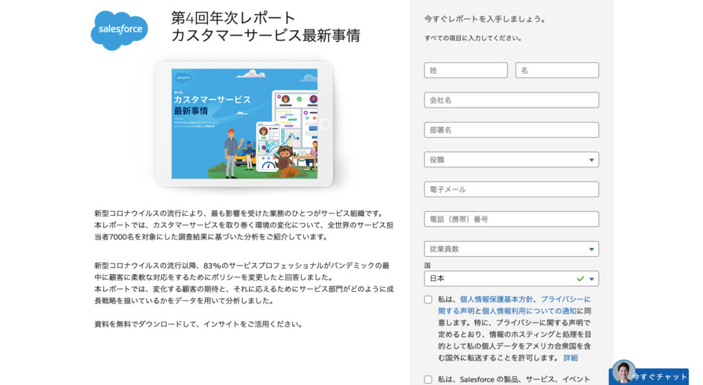 ここからは個別のホワイトペーパーの種類別事例を紹介します。Salesforceはセールスフォース・ドットコムによるツールで、顧客関係管理ソリューションを中心としたサービスを提供しています。Salesforceのホームページでは、名前や会社名、メールアドレスを入力することでホワイトペーパーをダウンロードできます。内容としては全世界のサービス担当者7,000名を対象にした調査を基にした、カスタマーサービス最新事情がまとめられています。