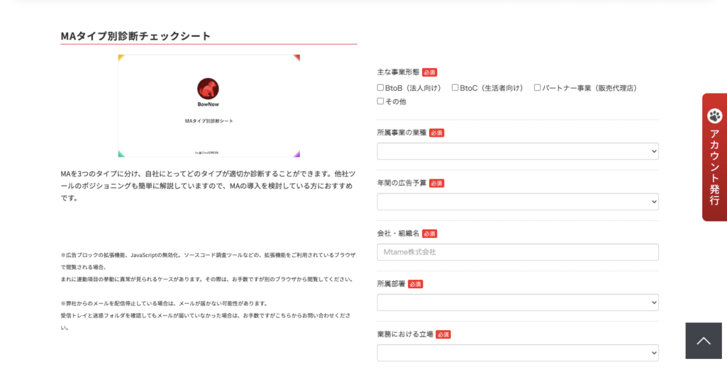 bownowはMtame株式会社によるマーケティングオートメーションツールで、無料で始められる点が魅力となっています。bownowのホームページでも、「MAタイプ別診断チェックシート」というホワイトペーパーを入手するにはユーザー情報を送信する必要があります。MAの導入を検討しているユーザーに向けたホワイトペーパーとなっており、自社にとってどのタイプがマッチしているかを診断できます。