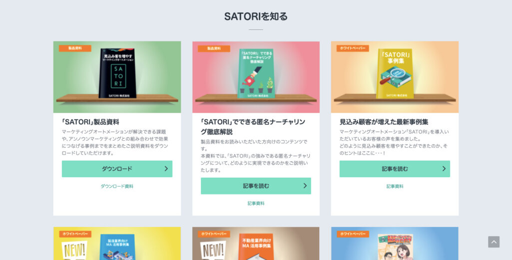 SATORI株式会社はマーケティング活動を支援するサービスを提供している企業で、ホームページで掲載しているホワイトペーパーはさまざまな種類のものが並んでいます。