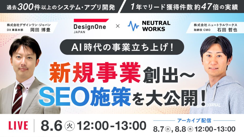 デジタルマーケティング支援事業を展開する株式会社ニュートラルワークス(神奈川県藤沢市 代表取締役:三木五月、以下 ニュートラルワークス)は、REHATCH株式会社(東京都千代田区 代表取締役:迫田 亮太、以下 REHATCH)と、株式会社WACUL(東京都千代田区 代表取締役 社長 大淵 亮平、以下 WACUL)と2024年8月1日にオンラインウェビナーを共催する運びとなりました。