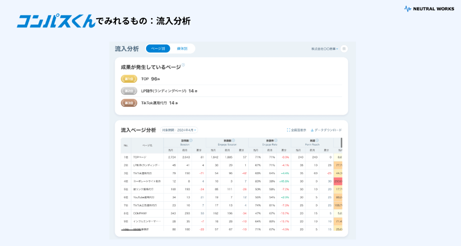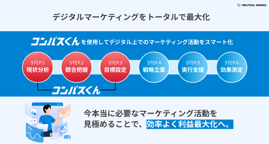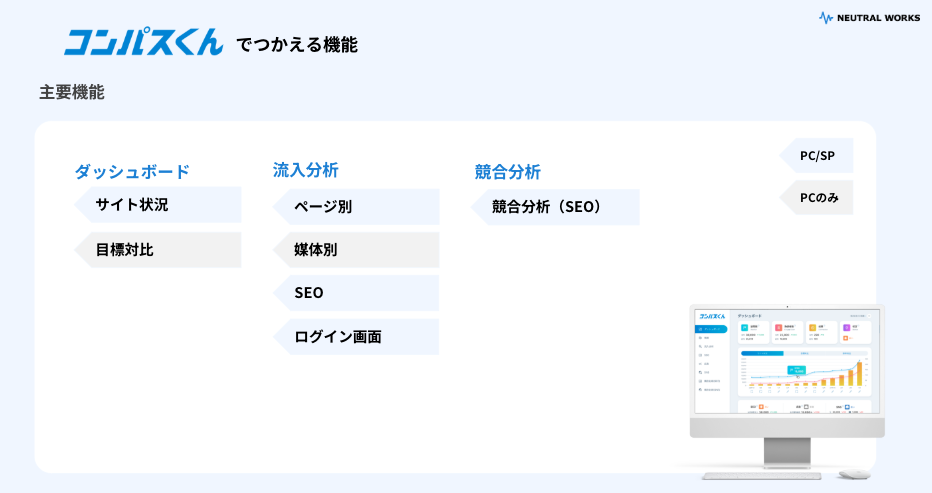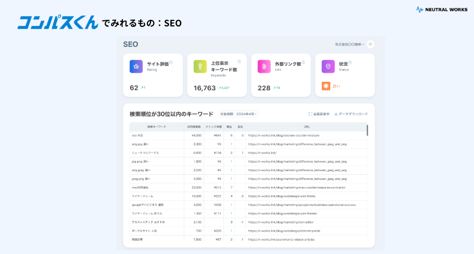 成果を出すためのブランド戦略からサイト構築、SEO、集客支援までワンストップで手掛けるデジタルマーケティング カンパニー、株式会社ニュートラルワークス(神奈川県藤沢市、代表取締役:三木五月/以下、ニュートラルワークス)が、Webサイトの状況を分かりやすく可視化させる、マーケティングルーツ「コンパスくん」を提供開始いたします。