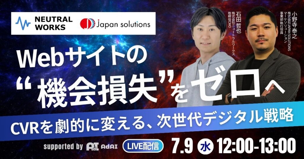 デジタルマーケティング支援事業を展開する株式会社ニュートラルワークス(神奈川県藤沢市 代表取締役:三木五月、以下 ニュートラルワークス)は、株式会社JAPAN SOLUTIONS(本社: 東京都新宿区、代表取締役:余頃建、以下 JAPAN SOLUTIONS)と共催セミナーを実施いたします。