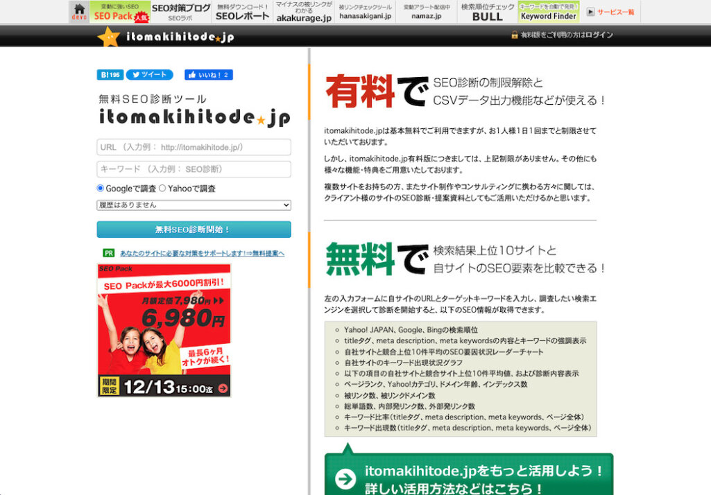 itomakihitode.jpは、SEO診断ツールです。無料版と有料版がありますが、無料で以下のことがわかります。
