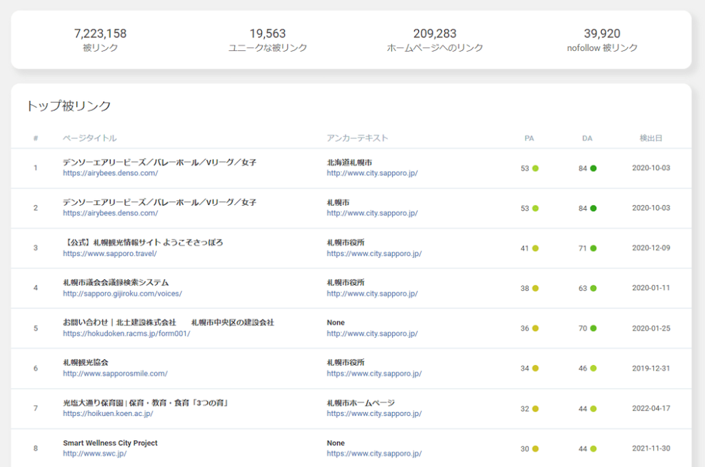 また、以下の画像のように被リンクサイトのPA(Page Authority)やDA(Domain Authority)も表示されます。