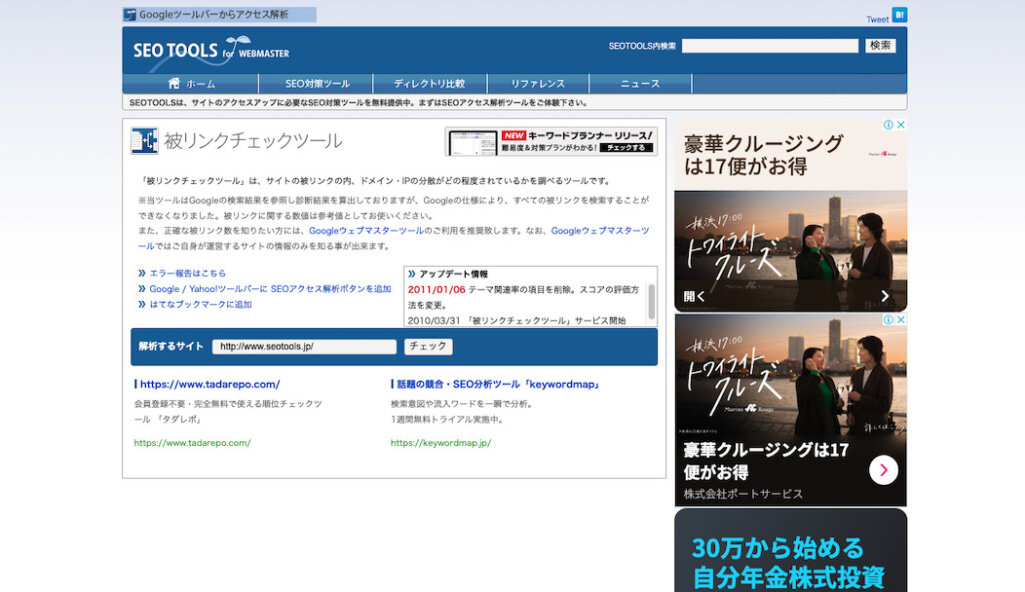 | SEOTOOLS「被リンクチェックツール」 | https://www.seotools.jp/005_linkcheck/ |
