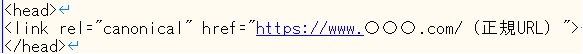 canonicalタグはHTMLの~タグの間に設置します。記述方法は以下の通りです。