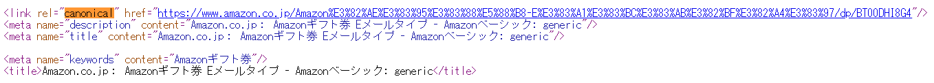 動的URLは、URLの末尾に「?」「&」が含まれている自動生成ページのことを指します。たとえばAmazonで内部検索からAmazonギフト券のページに到達した際のURLは、上の画像内に記載されている動的URLになります。Amazonは上記のページの中でcanonicalタグを使い、マスターとなる静的URL(パラメータなしのURL)を指定しています。
