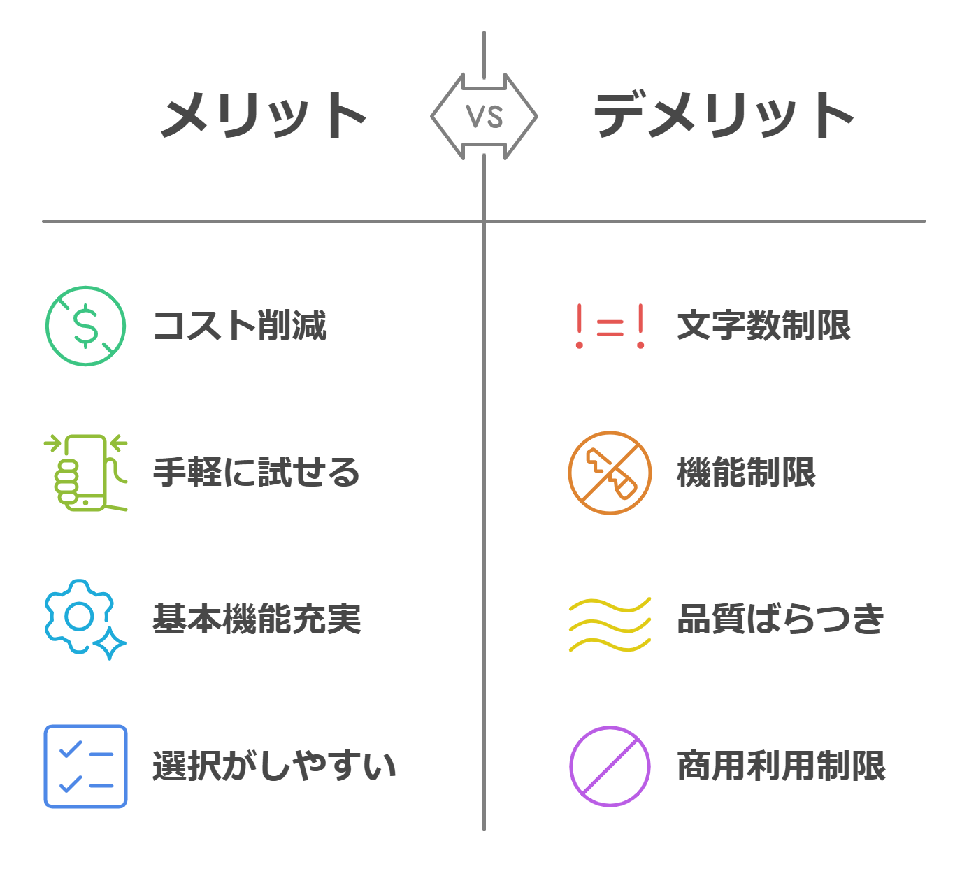 無料で試せて基本機能が使えるのがメリットです。一方、文字数や機能に制限があり、商用利用できない場合もあるため、本格活用には有料版がおすすめです。