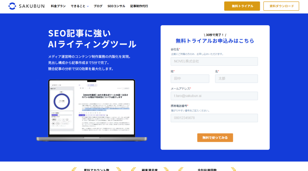 SAKUBUN(サクブン)は、SEO記事作成に強いAIライティングツールです。競合の分析、ペルソナの指定、文章トーンの調整、アイキャッチ画像の作成など、SEO記事を作るのに必要な機能が搭載されています。無料プランでは月5,000文字まで利用できます。