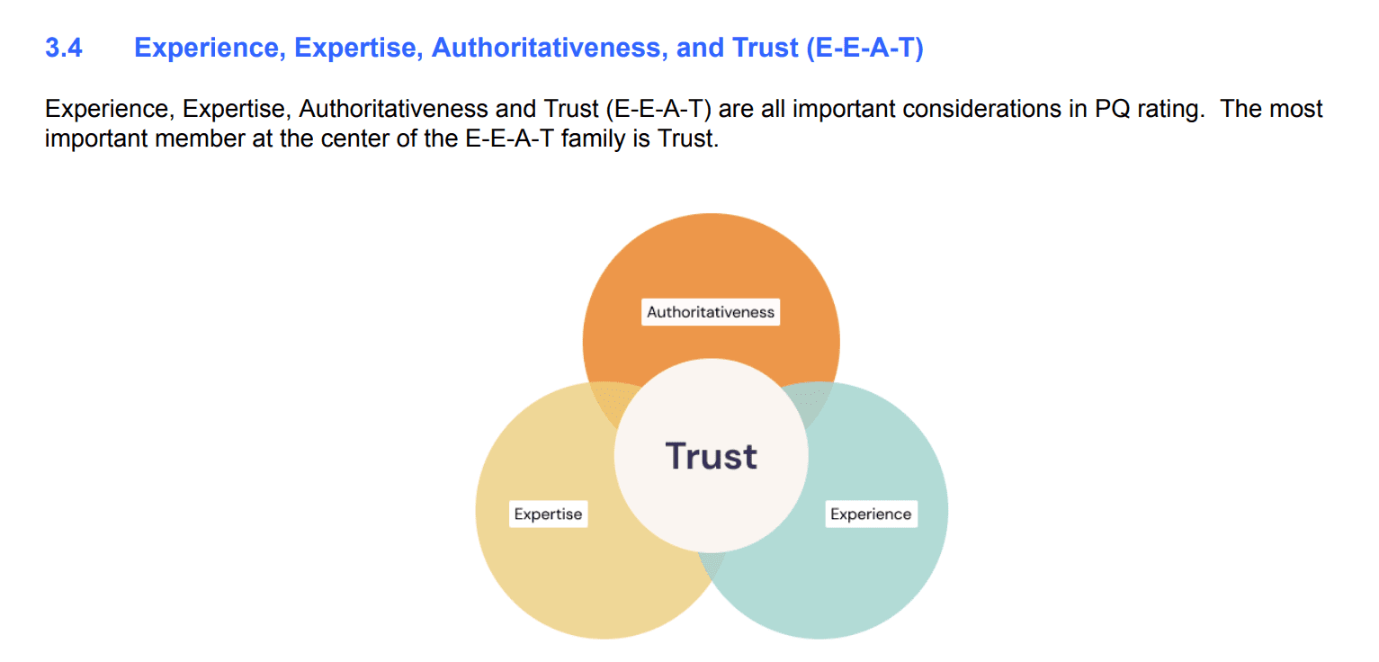 検索品質評価ガイドラインで示された以下の図からも分かるとおり、 Trusts(信頼)はE(経験・体験)、E(専門性)、A(権威性)によって成り立っています。